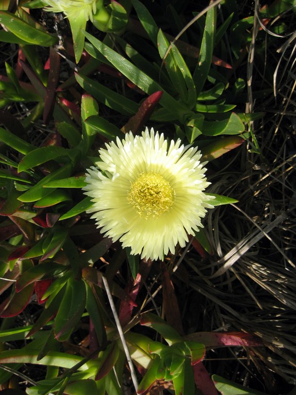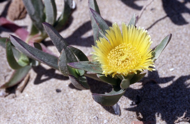 Planta perenne, reptante, con tallos postrados muy ramificados y que enraízan con mucha facilidad (gran facilidad de multiplicación vegetativa). Hojas suculentas, opuestas, erectas, de sección triangular y un color verde que finalmente se torna rojizo. Florece en primavera y sus flores son hermafroditas, grandes y solitarias, con numerosos estaminodios petaloideos de color amarillo o rosáceos (C. edulis var. rubescens Druce). Tiene un fruto carnoso que contiene numerosas semillas.